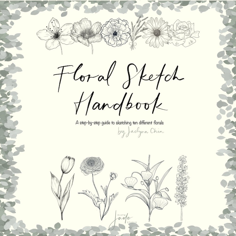 An easy step-by-step guide to sketching 10 different florals! Learn how to draw all the florals shown on the front cover - Cosmos, Daisy, Lavender, Jasmine, Rose, Tulip, Delphinium, Ranunculus, Golden Lantern Lily and Marigold!